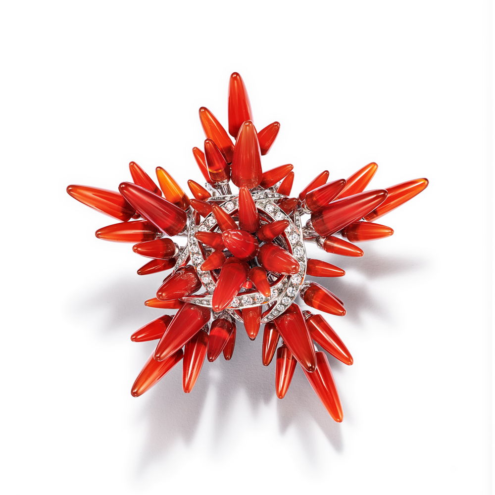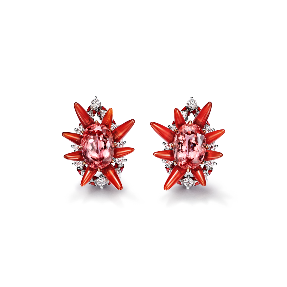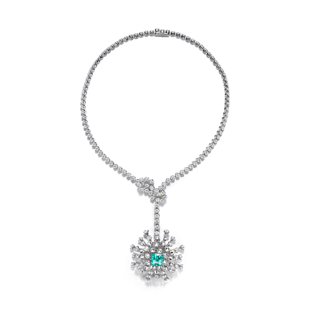 Parmi les autres créations notables du lancement d'automne, citons : un collier coquillage orné de diamants et d'une tourmaline cuprienne elbaite bleue de plus de 10 carats ; un collier Poissons orné d'un saphir orange non rehaussé de plus de 23 carats ; un collier Corail orné de saphirs violets non rehaussés de plus de 37 carats et de diamants ; et un pendentif Étoile de mer orné de diamants et d'une tourmaline cuprienne elbaite verte non rehaussée de plus de 22 carats.