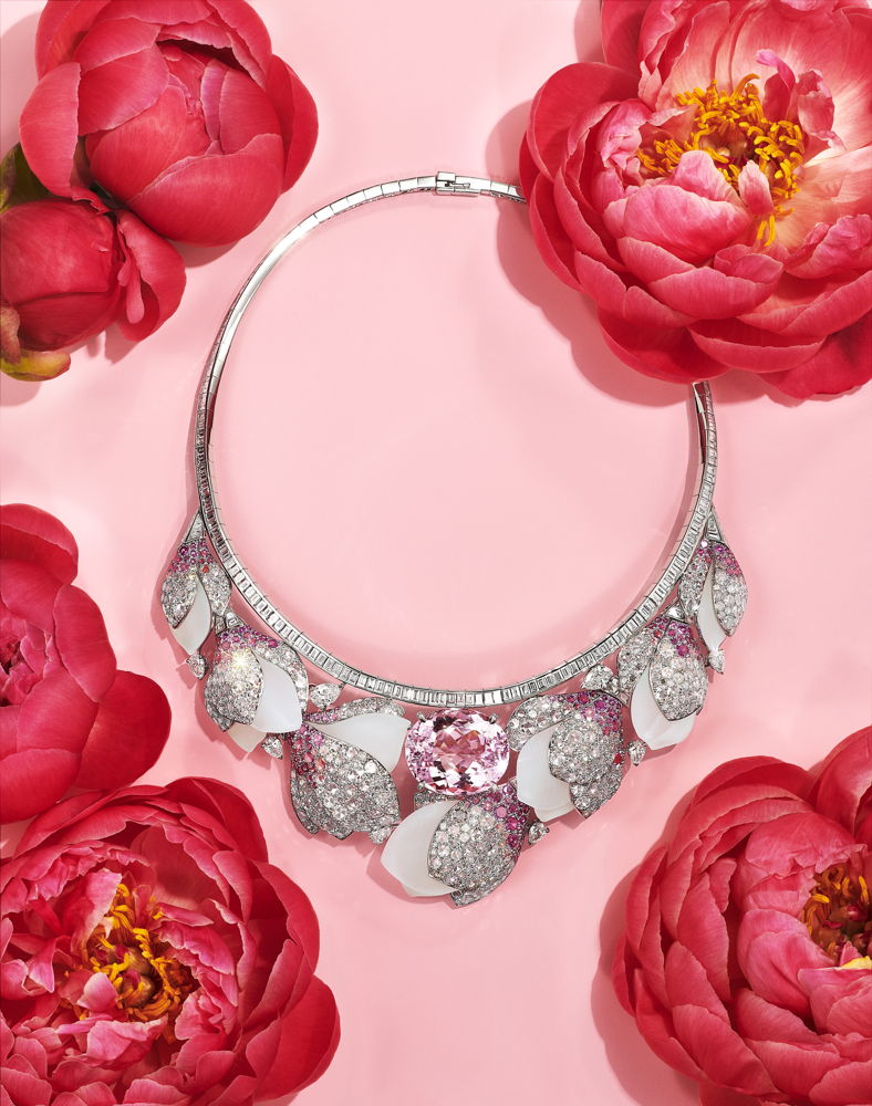 Le thème Magnolia de la collection offre une mise à jour contemporaine du motif floral, qui s'exprime également par une utilisation inventive de la calcédoine sculptée à la main, ainsi que des "pierres de l'héritage" de Tiffany & Co. telles que la tsavorite et la morganite, que la Maison a fièrement présentées au monde. Au cours des 185 ans d'histoire de Tiffany, la fleur de magnolia a été mise en valeur dans des créations de bijoux, des fenêtres en verre au plomb et le précieux vase Magnolia, qui a été présenté à l'exposition universelle de 1893 à Chicago et qui se trouve aujourd'hui au Met.