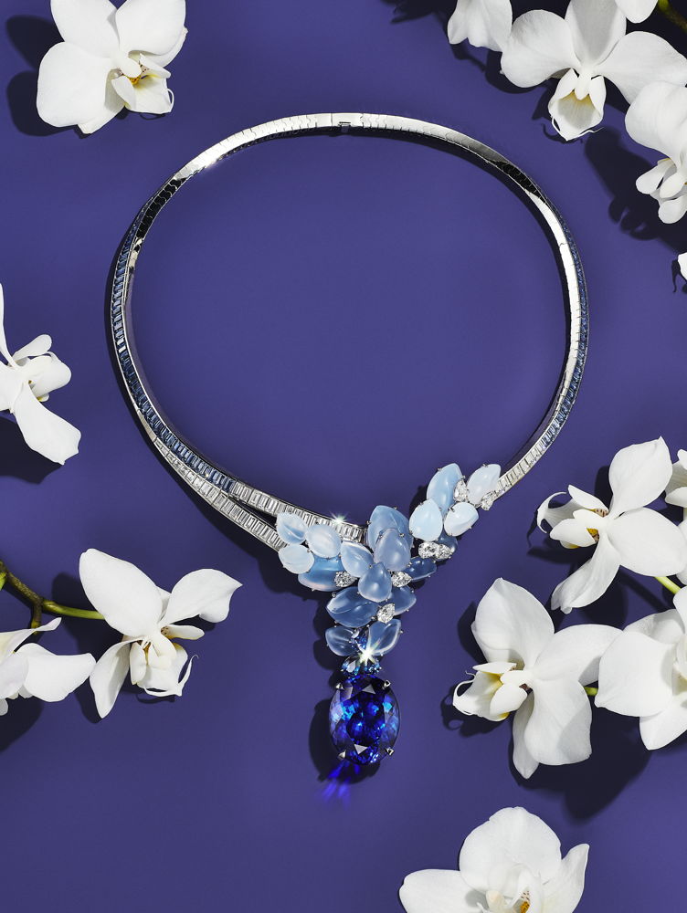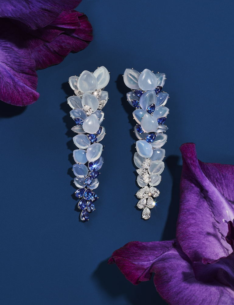 Le thème Wisteria de la collection automnale de haute joaillerie Blue Book s'inspire des formes et des couleurs des lampes de table emblématiques de Louis Comfort Tiffany, popularisées pendant la période Art nouveau. Pour BOTANICA : Blue Book 2022, les artisans de Tiffany ont revisité les pétales de la glycine avec de la calcédoine sculptée à la main. Des saphirs fantaisie en forme de poire et des diamants sont nichés parmi les pétales.